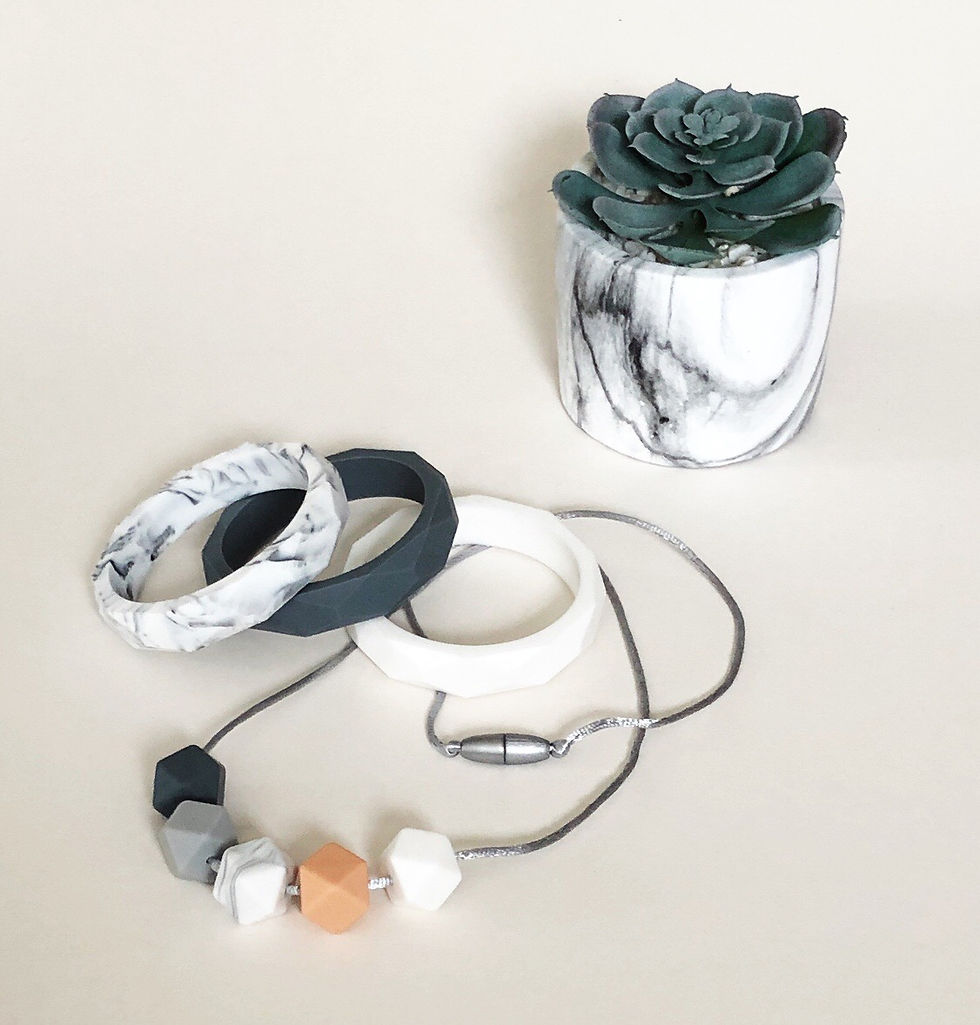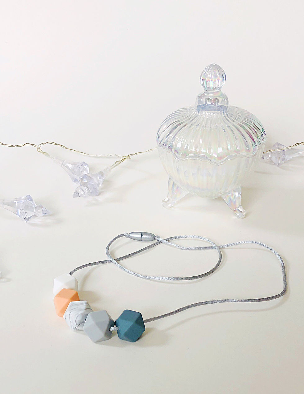 We have a range of lovely handmade silicone teething necklaces and bracelets. All made from non toxic 100% BPA free food grade silicone making them safe for your littles ones to chew on and play with during nursing, cuddle time or baby wearing.